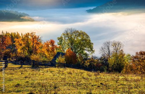 autumn countryside with valley full of thick fog. gorgeous scenery at sunrise in mountainous area. view from the top of a hill