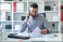 Fototapeta - A young man is sitting in the office, talking on the phone and working with documents.