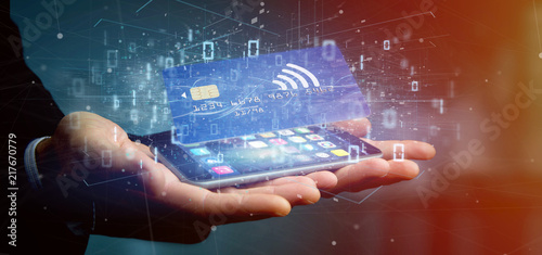 Fototapeta - Man holding a contactless credit card payment concept 3d rendering