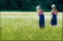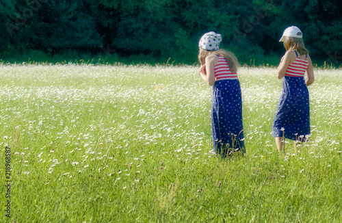 Fototapeta - dwie dziewczyny na łące polują na motyle , aktywny wypoczynek na letnich wakacjach