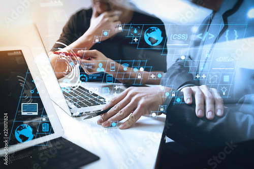 >Plakat>Business team meeting. Photo professional investor working new start up project. Finance task.Digital tablet docking keyboard laptop computer smart phone using, filter film effect
