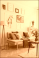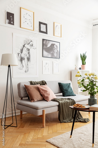 Lamp next to grey sofa with cushions in white flat interior with posters and flowers. Real photo