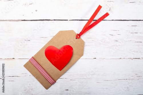 Bilecik do prezentu z serduszkiem. Romantyczny symbol na białym drewnianym tle