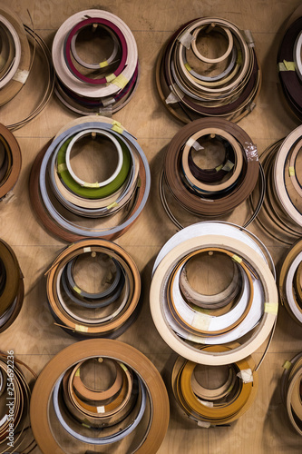 Fototapeta - Plastic pre glued edge banding tape for furniture decor and repair. Object is hanging on a wall in a workshop
