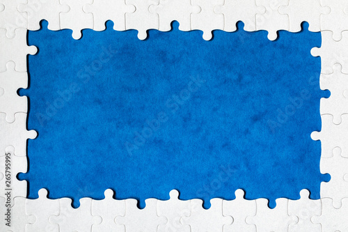 Fototapeta - Framing in the form of a rectangle, made of a white jigsaw puzzle. Frame text and jigsaw puzzles. Frame made of jigsaw puzzle pieces on blue background.