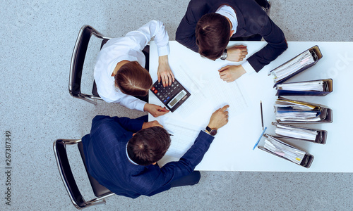 Fototapeta - Business people at meeting, view from above. Bookkeeper or financial inspector making report, calculating or checking balance