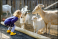>Plakat>Adorable cute toddler girl feeding little goats and sheeps on a kids farm. Beautiful baby child petting animals in the zoo. Excited and happy girl on family weekend.