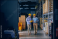 >Plakat>Two business partners in formal wear and with protective yellow helmets on heads walking and talking about business. Younger one holding folder with data while older one using tablet.