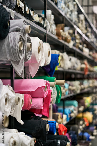 Fototapeta - Fabric warehouse with many multicolored textile rolls