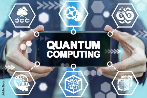Man hold smartphone with quantum computing words on display. Quantum qubit intelligent computing mobile technology.