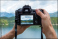 Fototapeta - Hands of a male photographer holding a digital camera taking pictures of a idyllic landscape with a lake and mountains while the picture shows at the display
