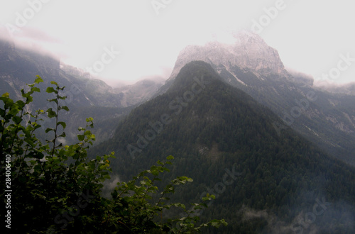 Fototapeta - Wysokie alpejskie szczyty górskie we mgle
