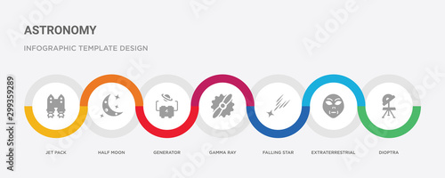 Fototapeta - 7 filled icon set with colorful infographic template included dioptra, extraterrestrial, falling star, gamma ray, generator, half moon, jet pack icons