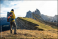 Fototapeta - Young man hiking at Seceda mountain peak at sunrise. Backpack, yellow jacket, boots, beanie. Traveling to puez Odle, Dolomites, Trentino, Italy.