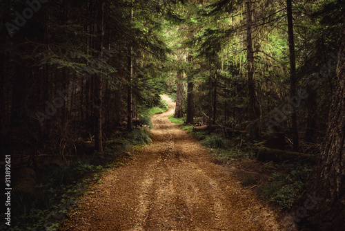 Fototapeta - Remote, unpaved, winding country road in the dense forest.