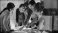 Fototapeta - Engineers Meeting in Technology Research Laboratory: Engineers Scientists and Developers Gathered Around Illuminated Conference Table, Talking and Finding Solution, Inspecting Industrial Engine Design