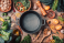 Various organic vegetables ingredients and empty iron cooking pot, wooden bowls, spoons on wooden background. Top view, copy space. Organic vegetables ingredients for vegan cooking. Clean eating food