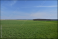 Zielone pole i skraj lasu na tle bezchmurnego, niebieskiego nieba.