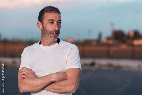 Caucasian athlete man with white t-shirt, looking to the side with serious face, posing on the street with a blue sky of clouds