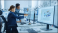 >Plakat>Inside Factory Office: Male Project Supervisor Talks to a Female Industrial Engineer who Works on Computer, Talk. In Workshop: Professional Workers Use High-Tech Industry 4 CNC Machinery, Robot Arm.