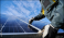 >Plakat>Close up of man technician in work gloves installing stand-alone photovoltaic solar panel system under beautiful blue sky with clouds. Concept of alternative energy and power sustainable resources.