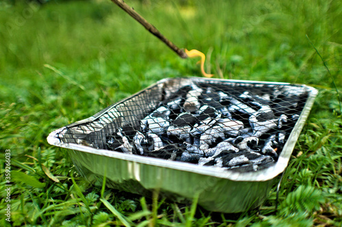 Fototapeta - Rozpalający się grill jednorazowy na trawie z płomieniem.
