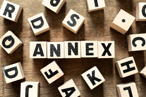 Fototapeta - Wood letter block in word annex on wood background with another alphabet