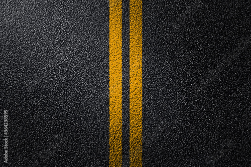 Top view of Double yellow lines on asphalt street roadway surface texture background.