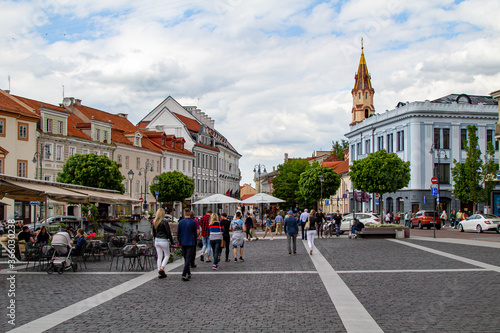>Plakat>Streets of the old city Vilnius Narrow streets and beautiful facades. Citizens and tourists walk, sit in cafes and see the sights of the city Summer 2020, after quarantine. Walk in the city. Good mood