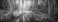 >Plakat>An old road (pathway) through the green forest. Ancient trees, moss and plants close-up. Sunbeams through the tree trunks. Panoramic view. Ecology, eco tourism, environmental conservation, pure nature