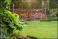 Zielony trawnik z drewnianą ławką w ogrodzie w angielskim stylu