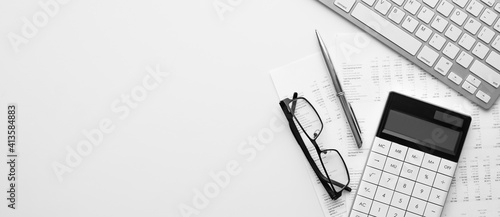 Calculator on financial statement and balance sheeet on desk of auditor. Concept of accounting and audit business.