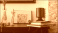 Fototapeta - Komódka mebel w salonie z ramką czerwoną, karteczką kolorową i lampką szklaną bordową