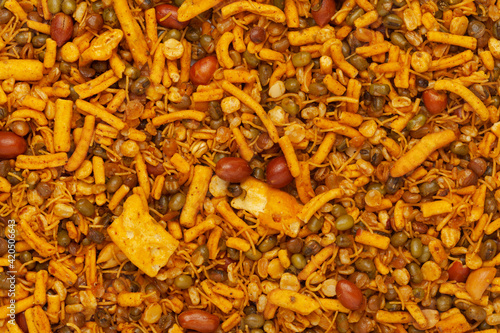 Fototapeta - Close-up of spicy Ratlami mixture Indian namkeen (snacks) Full-Frame Background. Top View