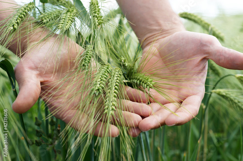 Fototapeta - Heranreifender Roggen Bauer hält seine Hände über das Getreidefeld