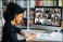>Plakat>Video call, online conference using app and computer. African American female student, studying remotely, watches an online lecture, taking notes, multiracial smiling people on the computer screen