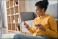 >Plakat>Young adult African American female consumer holding credit card and smartphone sitting on floor at home doing online banking transaction. E commerce virtual shopping, secure mobile banking concept.