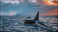 Orca Killerwhale traveling on ocean water with sunset Norway Fiords on winter background