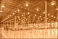 Interior of large warehouse industrial building with parked forklifts, shipping containers, and crates