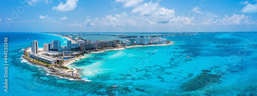 Aerial view of Punta Norte beach, Cancun, Mexico. Beautiful beach area with luxury hotels near the Caribbean sea in Cancun, Mexico.