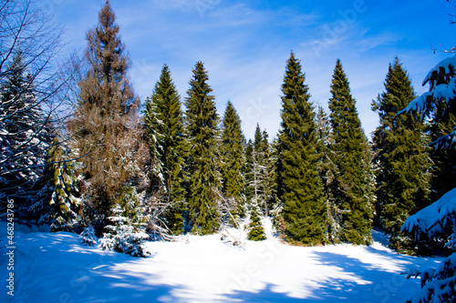 Winter landscape of a forest of snow-covered conifer trees in the Jemez Mountains, New Mexico