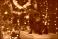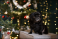 Fototapeta - Czarny mops siedzący pod choinką, zaciekawiony
