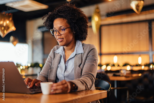 Fototapeta - Confident African-American novelist, writing her story on her laptop.