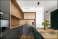 Nowoczesna kuchnia i jadalnia. Stół z zielonymi krzesłami obitymi zamszem. Fornir imitujący drewno na szafka oraz w szarościach
