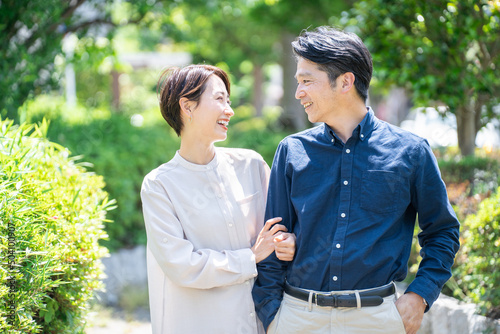笑顔のミドル夫婦(カップル・屋外・新緑)