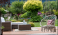 Fototapeta - Photo of a modern sofa with pillows set in the garden