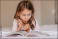 >Plakat>Emotional child girl read interesting book in bed. Small kid enjoy reading. Fantasy and fantastic. Developing child fantasy and imagination. Imaginary world. Fairy tale. Bedtime reading