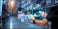 Business Logistics technology concept.Man hands using tablet on blurred warehouse as background