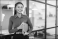 >Plakat>Carefree inspired african-american female employee standing in modern office space and holding laptop, cheerful black businesswoman in green shirt looks at the camera with light friendly smile