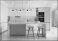 Fototapeta - Nowoczesna przestronna kuchnia z wolnostojącą wyspą kuchenną. W kuchni połączone zostały białe i drewniane fronty z jasnym marmurowym blatem.